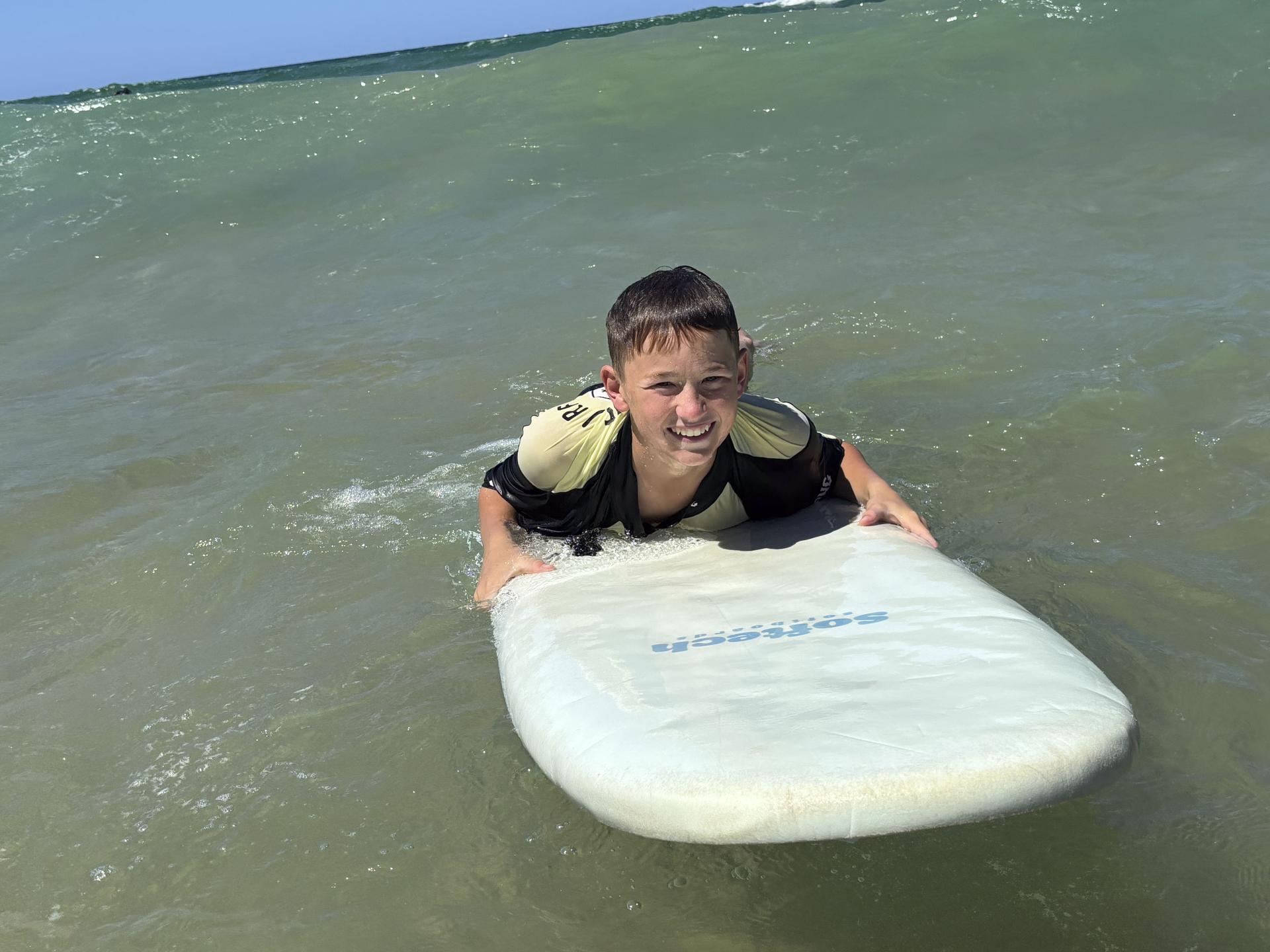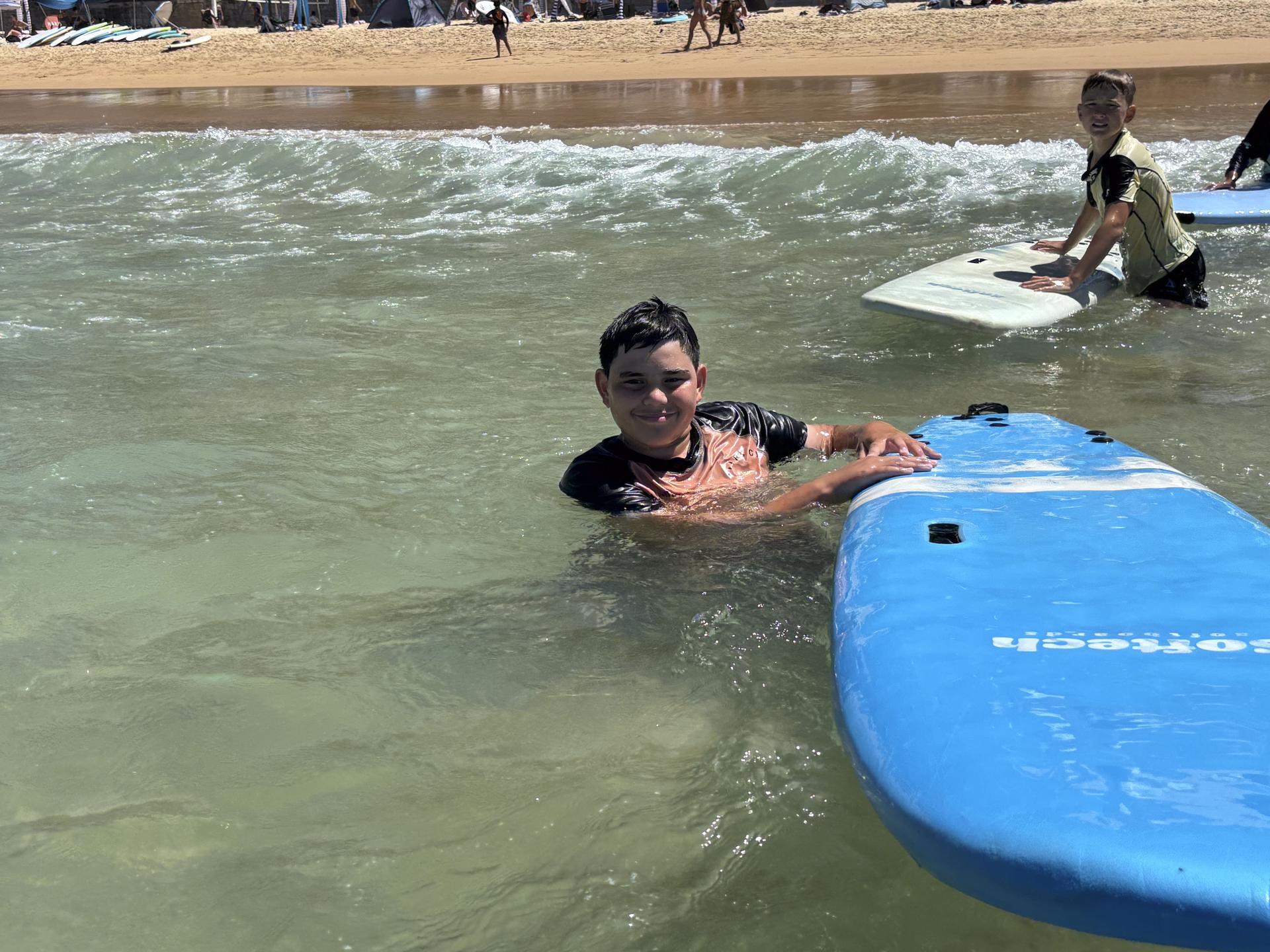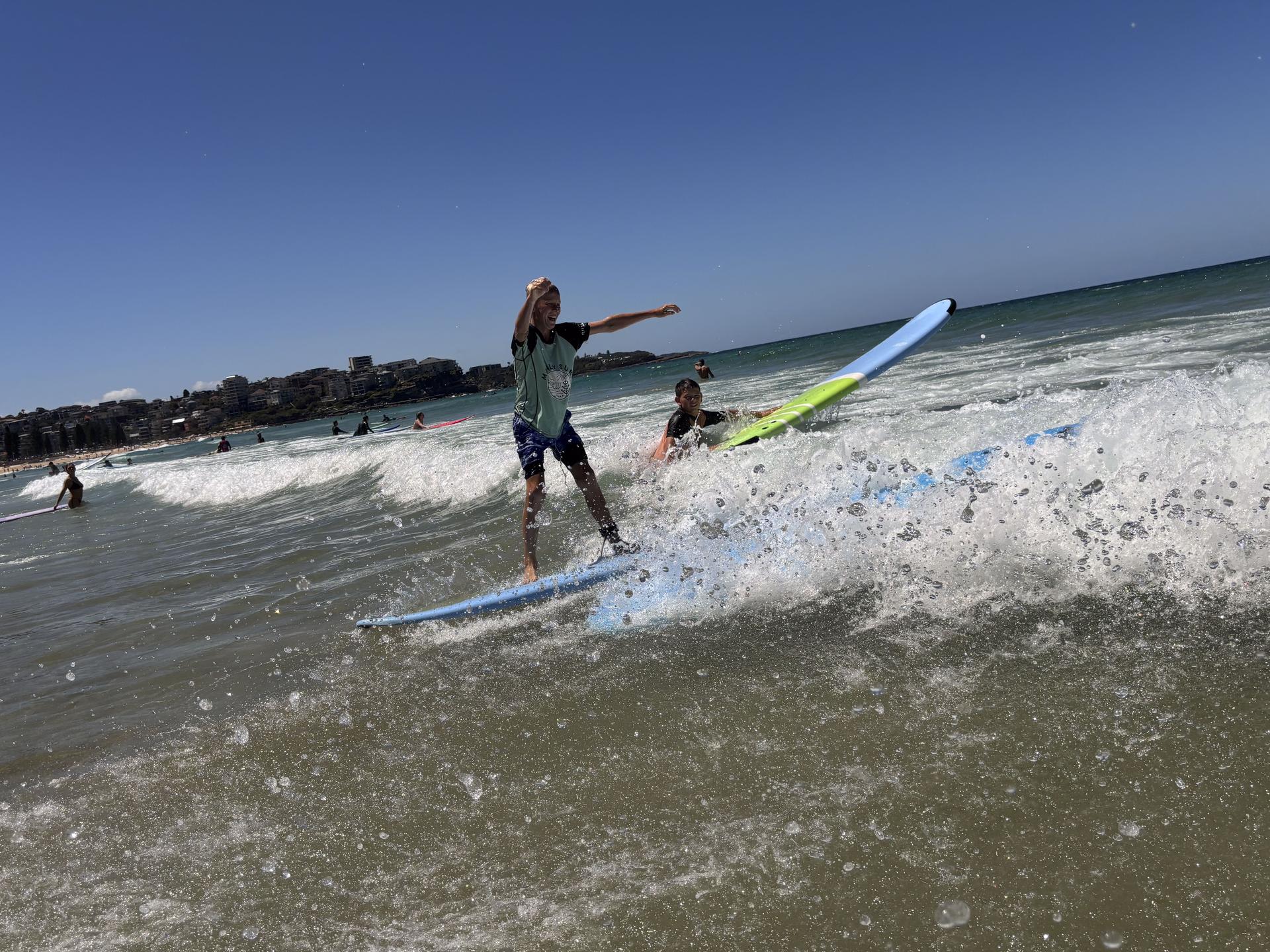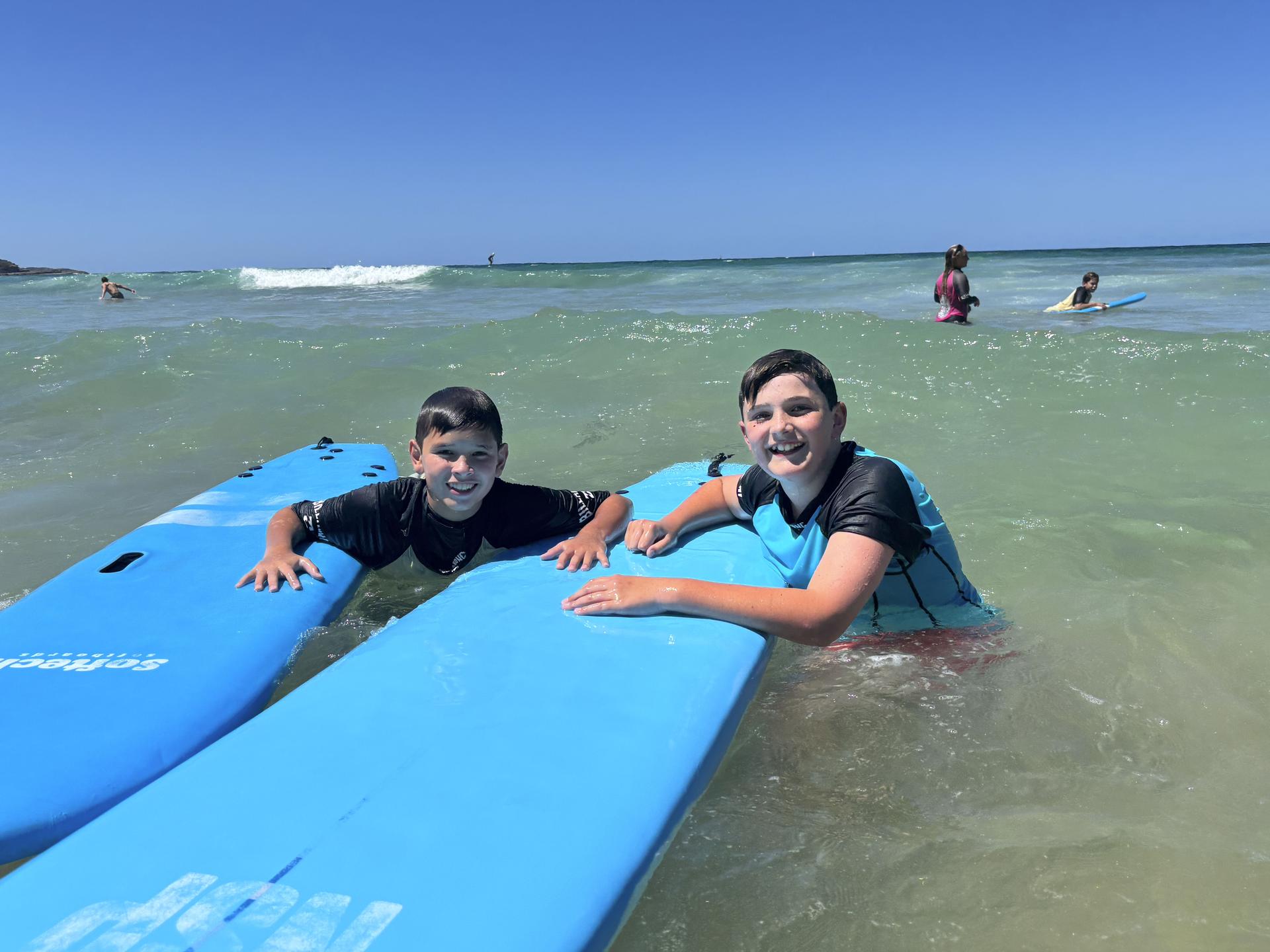 With boards in hand, the boys hit the sand for a quick land-based tutorial—cue plenty of exaggerated paddling and some very questionable ‘pop-up’ techniques. Then it was time for the real challenge: taking on the waves! The first few attempts resulted in more wipeouts than rides, but with plenty of encouragement, the boys started catching waves like pros.