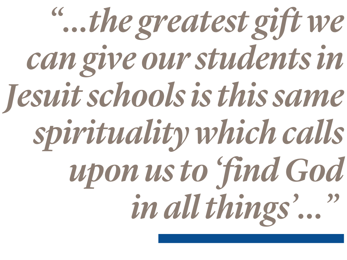 The spirituality that Ignatius revealed is the Jesuits’ great gift to us – their contemporary, lay companions. And the greatest gift we can give our students in Jesuit schools is this same spirituality which calls upon us to ‘find God in all things’ and especially in those in our world who have the greatest claim on our gifts and our talents – the last, the lost and the lonely.