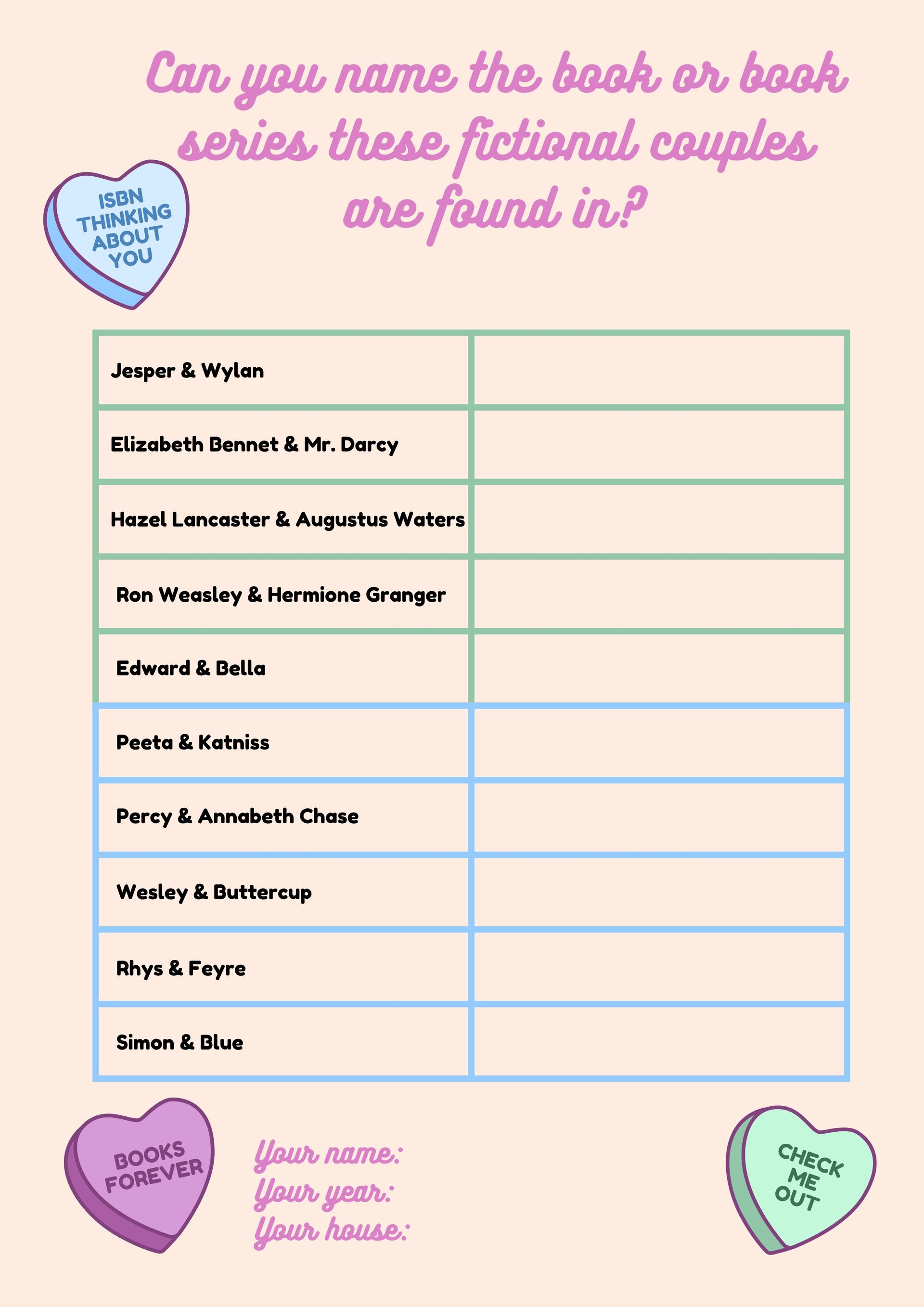 Can you name all of these fictional couples? We will be awarding a prize to our winner next Monday.