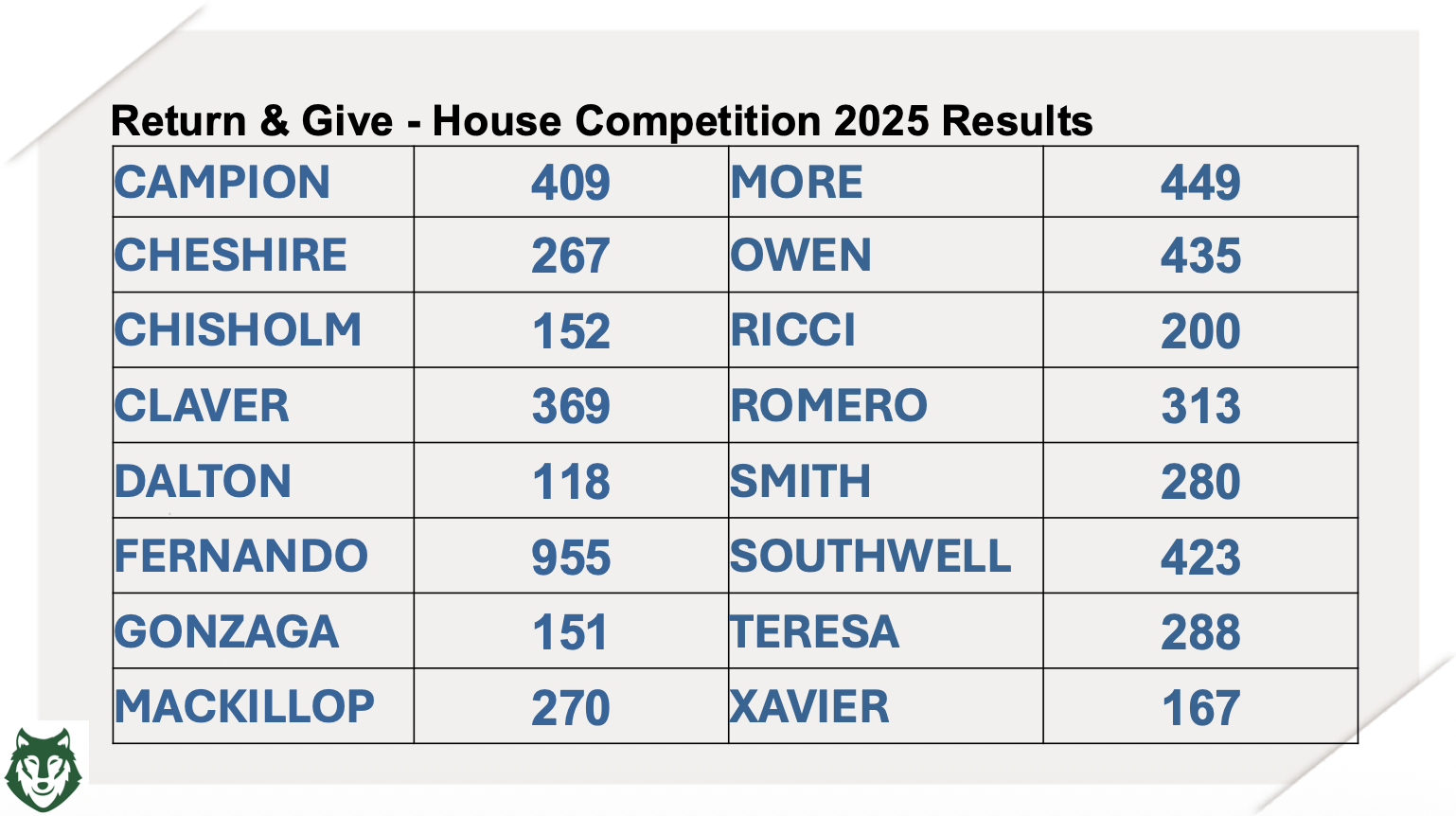 Congratulations to Fernando House who came first collecting 955 items, followed by Owen on 435 and Southwell on 423.