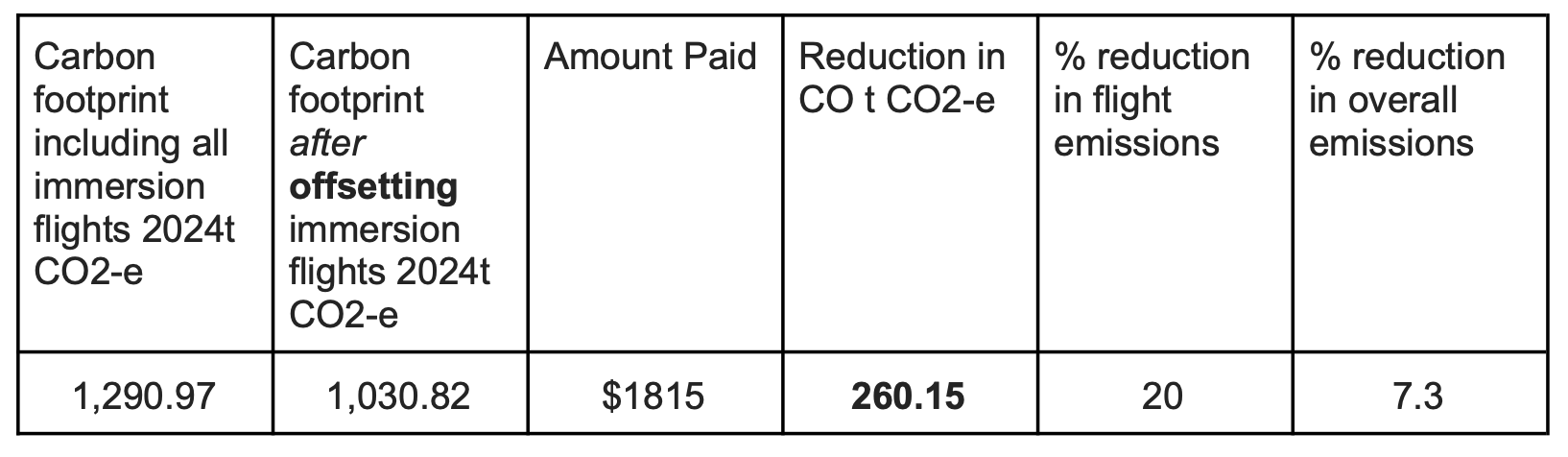 In December 2023, the Carbon Offsetting Program was piloted on all International Immersion Flights. This included immersion flights in July to Cambodia and in December to Cambodia, Nepal and India. The carbon emitted was calculated using our 100% Renewables Software. A total of 1031 t CO2-e of carbon was emitted from these flights, calculated using this software. Through TEM’s Extended Impact: NSW Biodiversity Credit + April Salumei Rainforest Conservation Project, approximately 260 tonnes CO2-e was offset (20% of the total flight emissions) from our overall carbon footprint.